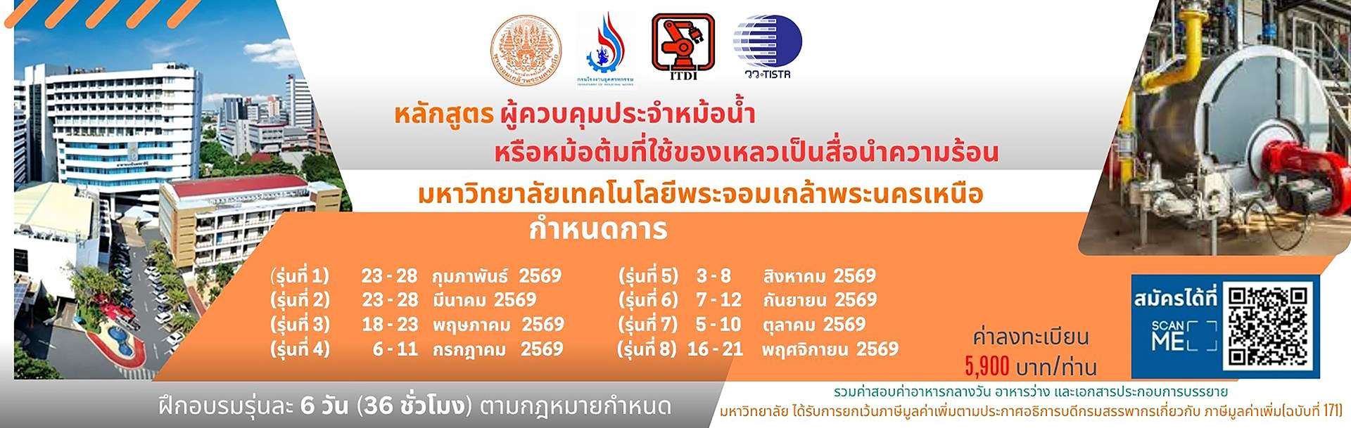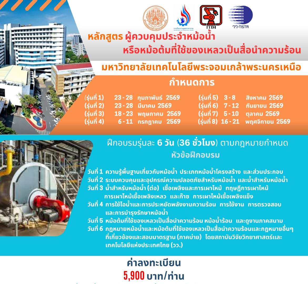สำนักพัฒนาเทคโนโลยีเพื่ออุตสาหกรรม มจพ. จัดโครงการฝึกอบรมหลักสูตร “ผู้ควบคุมประจำหม้อน้ำหรือหม้อต้มที่ใช้ของเหลวเป...