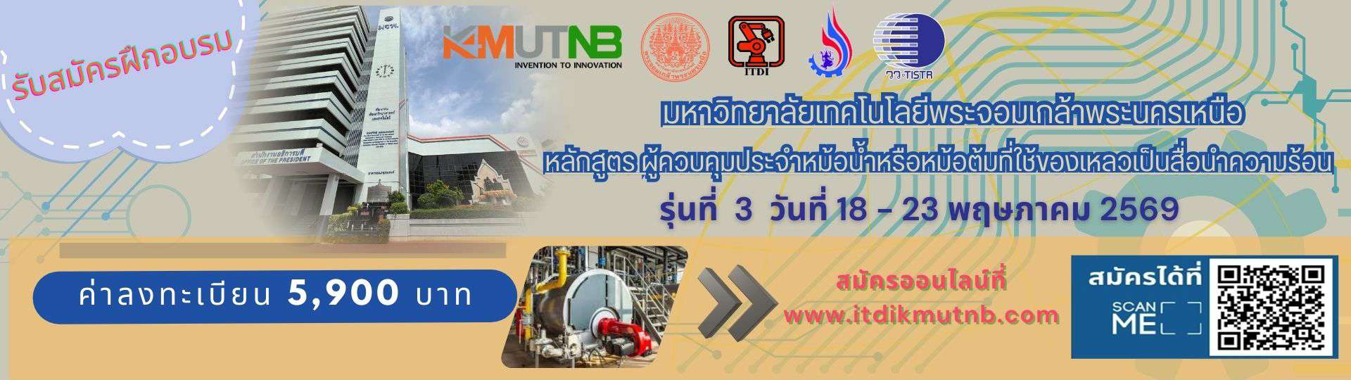 สำนักพัฒนาเทคโนโลยีเพื่ออุตสาหกรรม มจพ. จัดโครงการฝึกอบรมหลักสูตร “ผู้ควบคุมประจำหม้อน้ำหรือหม้อต้มที่ใช้ของเหลวเป...