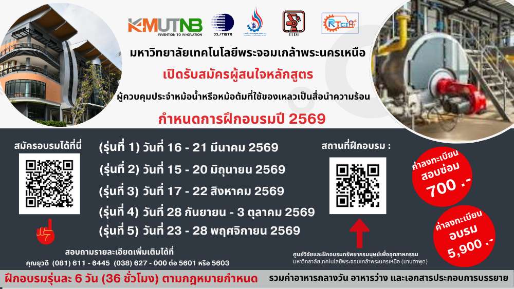 สำนักพัฒนาเทคโนโลยีเพื่ออุตสาหกรรม มจพ. จัดโครงการฝึกอบรมหลักสูตร “ผู้ควบคุมประจำหม้อน้ำหรือหม้อต้มที่ใช้ของเหลวเป...