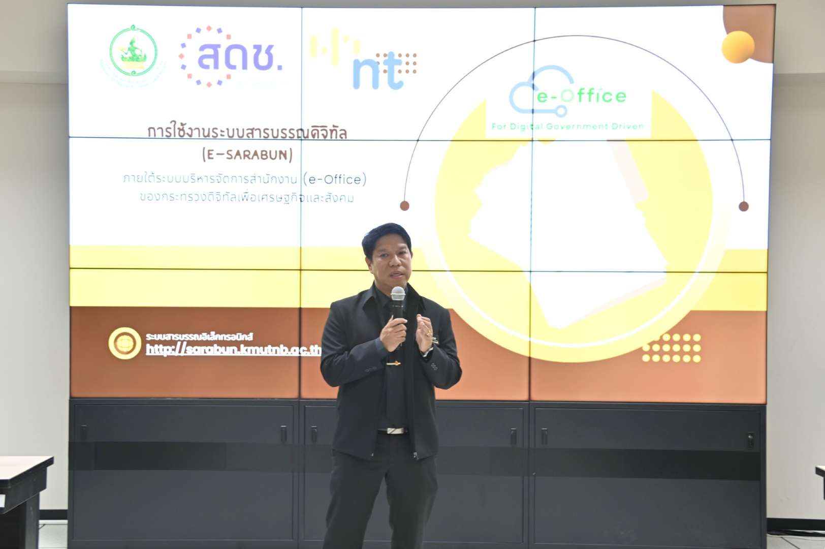 เมื่อวันที่ 24 ธันวาคม 2568 รองศาสตราจารย์ ดร.ฉัตรชาญ ทองจับ ผู้อำนวยการสำนักพัฒนาเทคโนโลยีเพื่ออุตสาหกรรม เป็นประธานในพิธีเปิดโครงการอบรม เรื่อง “การใช้งานระบบสารบรรณอิเล็กทรอนิกส์ (e-saraban) ภายใต้ ระบบบริหารจัดการสำนักงาน (e-office) ของกระทรวงดิจิตอลเพื่อเศรษฐกิจและสังคม” โดยมีวัตถุประสงค์เพื่อใช้ในการบริหารจัดการด้านงานสารบรรณอิเล็กทรอนิกส์ เพื่อช่วยเพิ่มประสิทธิภาพ ความรวดเร็ว ลดต้นทุนในการจัดการเอกสาร ทำให้ประหยัดเวลาและทรัพยากร นอกจากนี้ยังช่วยเพิ่มความปลอดภัยของข้อมูล อำนวยความสะดวกให้กับเจ้าหน้าที่ ในการรับ-ส่ง สามารถตรวจสอบเอกสารได้ตลอดเวลา มีความถูกต้องรวดเร็ว และมีประสิทธิภาพ ณ ห้องฝึกอบรม 709 ชั้น 7 สำนักพัฒนาเทคโนโลยีเพื่ออุตสาหกรรม อาคารอเนกประสงค์ มหาวิทยาลัยเทคโนโลยีพระจอมเกล้าพระนครเหนือ