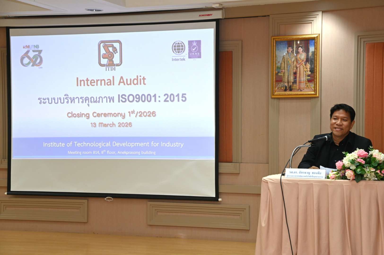 เมื่อวันที่ 13 มีนาคม 2569 รองศาสตราจารย์ ดร.ฉัตรชาญ ทองจับ ผู้อำนวยการสำนักพัฒนาเทคโนโลยีเพื่ออุตสาหกรรม มหาวิทยาลัยเทคโนโลยีพระจอมเกล้าพระนครเหนือ เป็นประธานกล่าวปิดการตรวจติดตามคุณภาพภายใน (Internal Audit) ครั้งที่ 1/2569 ระหว่างวันที่ 9-16 มีนาคม 2569 ซึ่งการตรวจติดตามคุณภาพภายในมีวัตถุประสงค์เพื่อให้การดำเนินงานระบบบริหารคุณภาพ ISO 9001: 2015 มีประสิทธิภาพต่อเนื่อง โดยมีคณะผู้ตรวจติดตามคุณภาพภายใน (Internal Audit) ประกอบด้วย